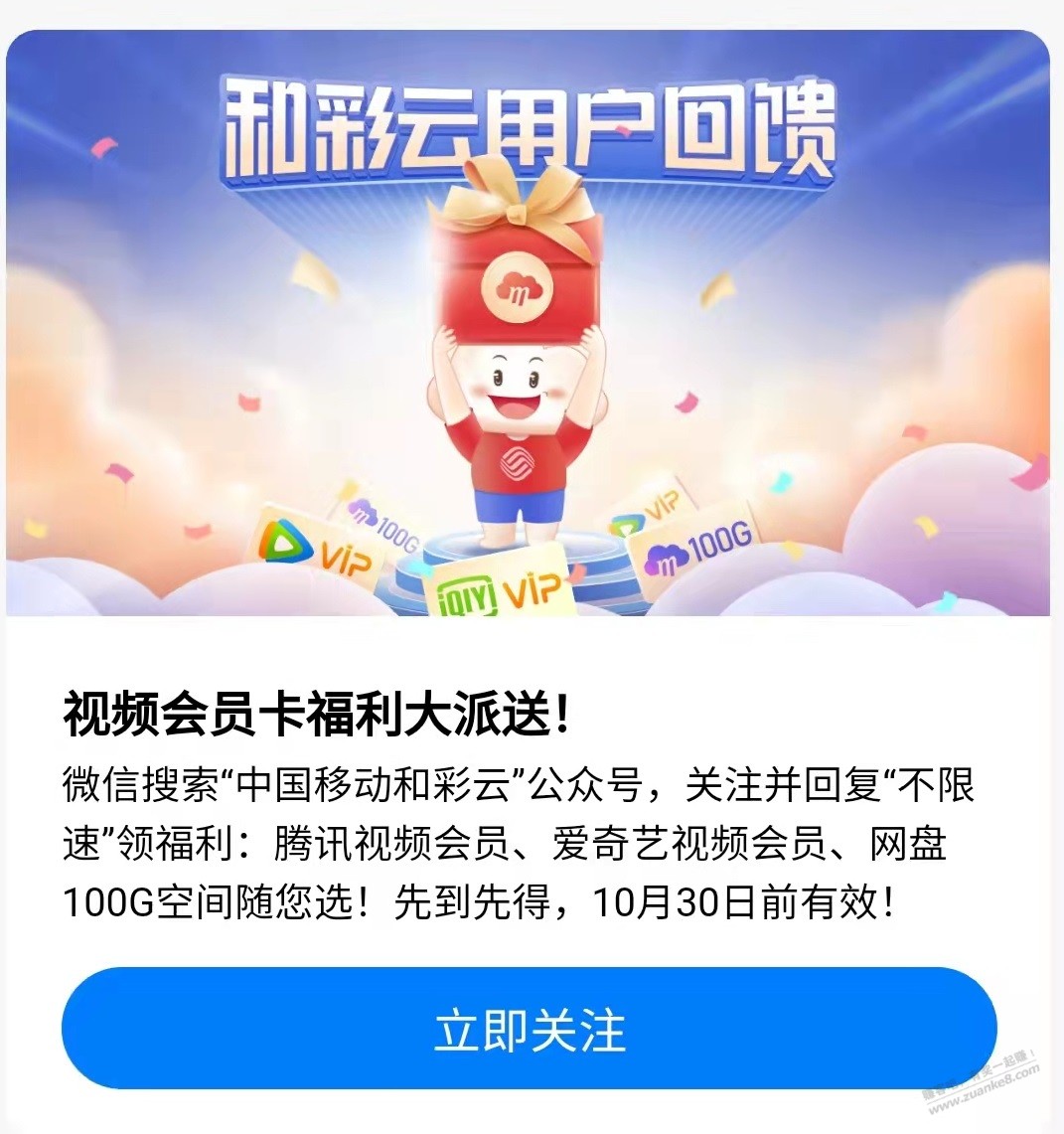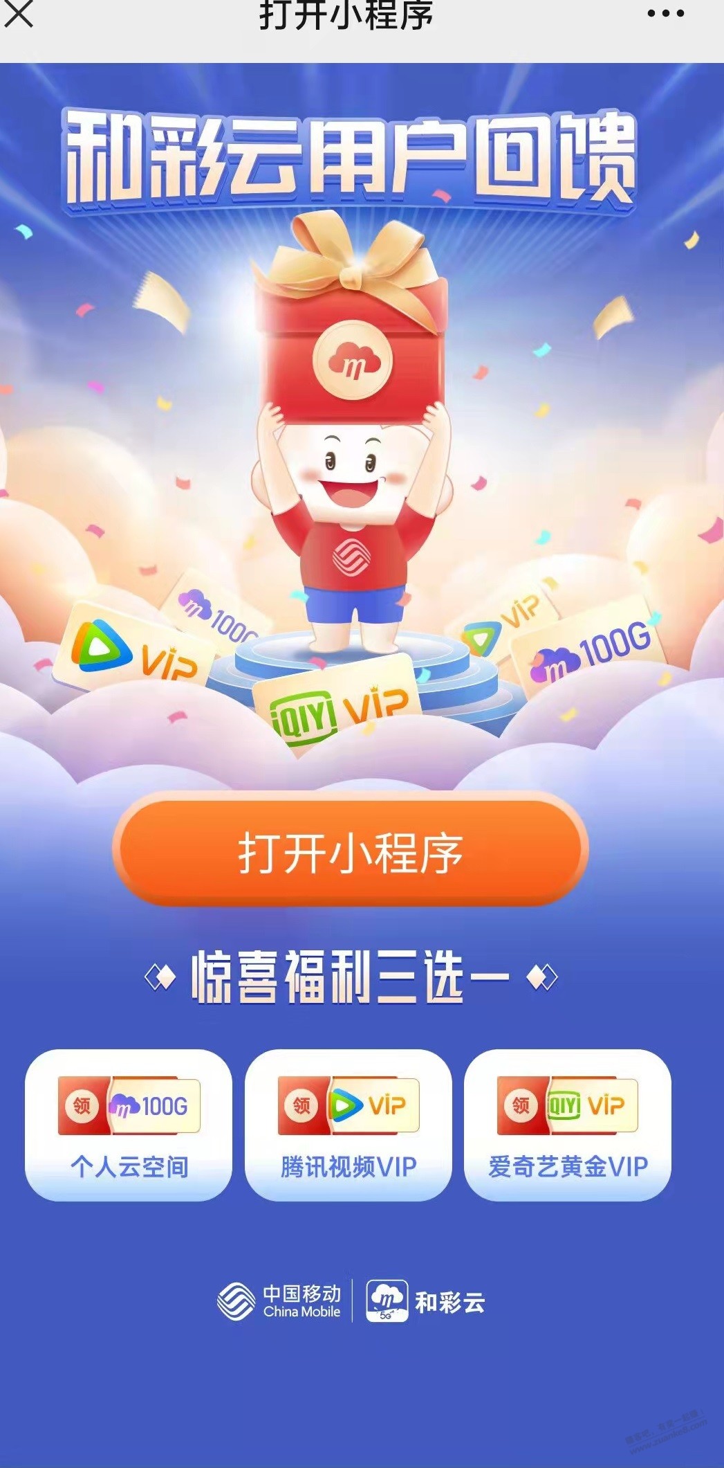 微信搜索“中国移动和彩云”公众号,关注并回复“不限速”领福利:腾讯视频会员、爱奇艺视频会员、