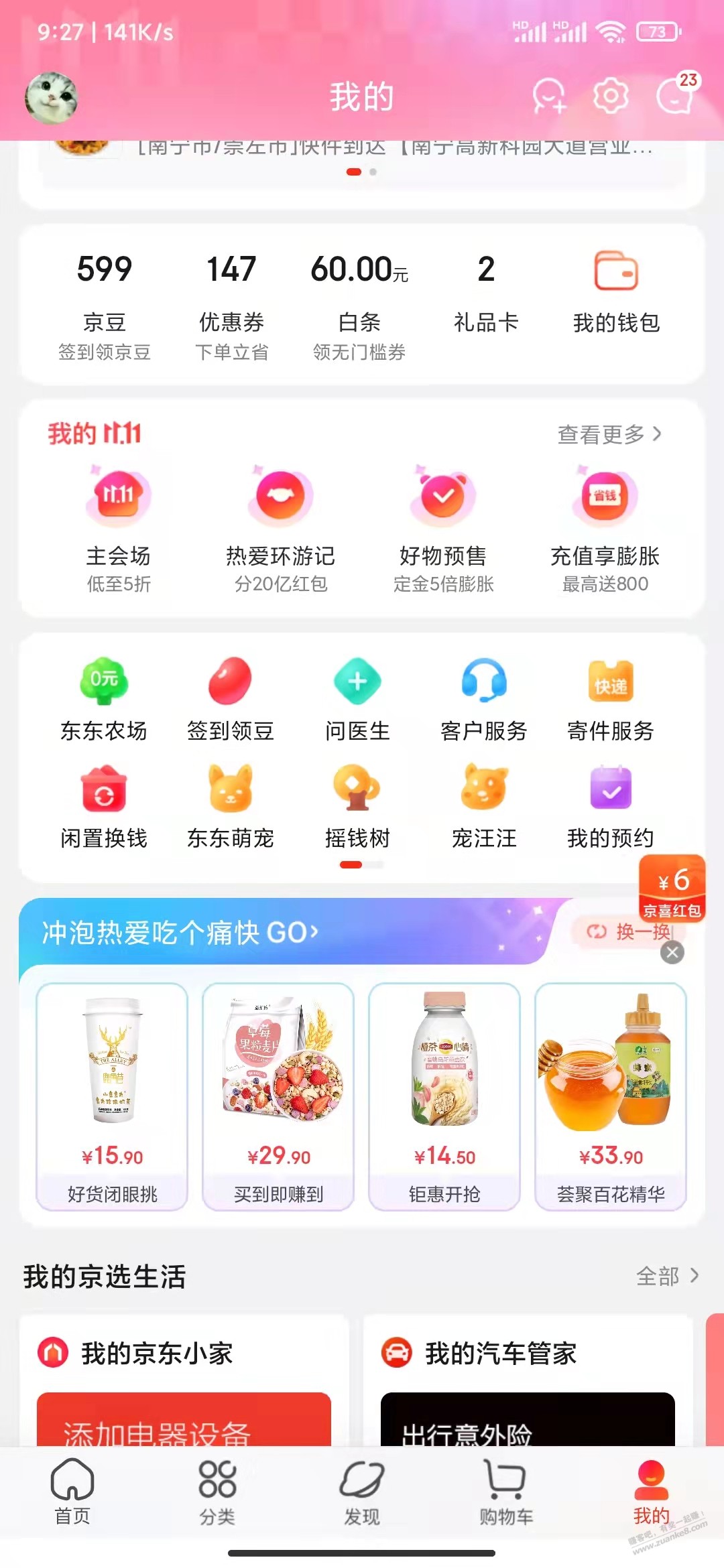 京东app 我的 悬浮小红包 6元 惊喜店铺可以用 4中4