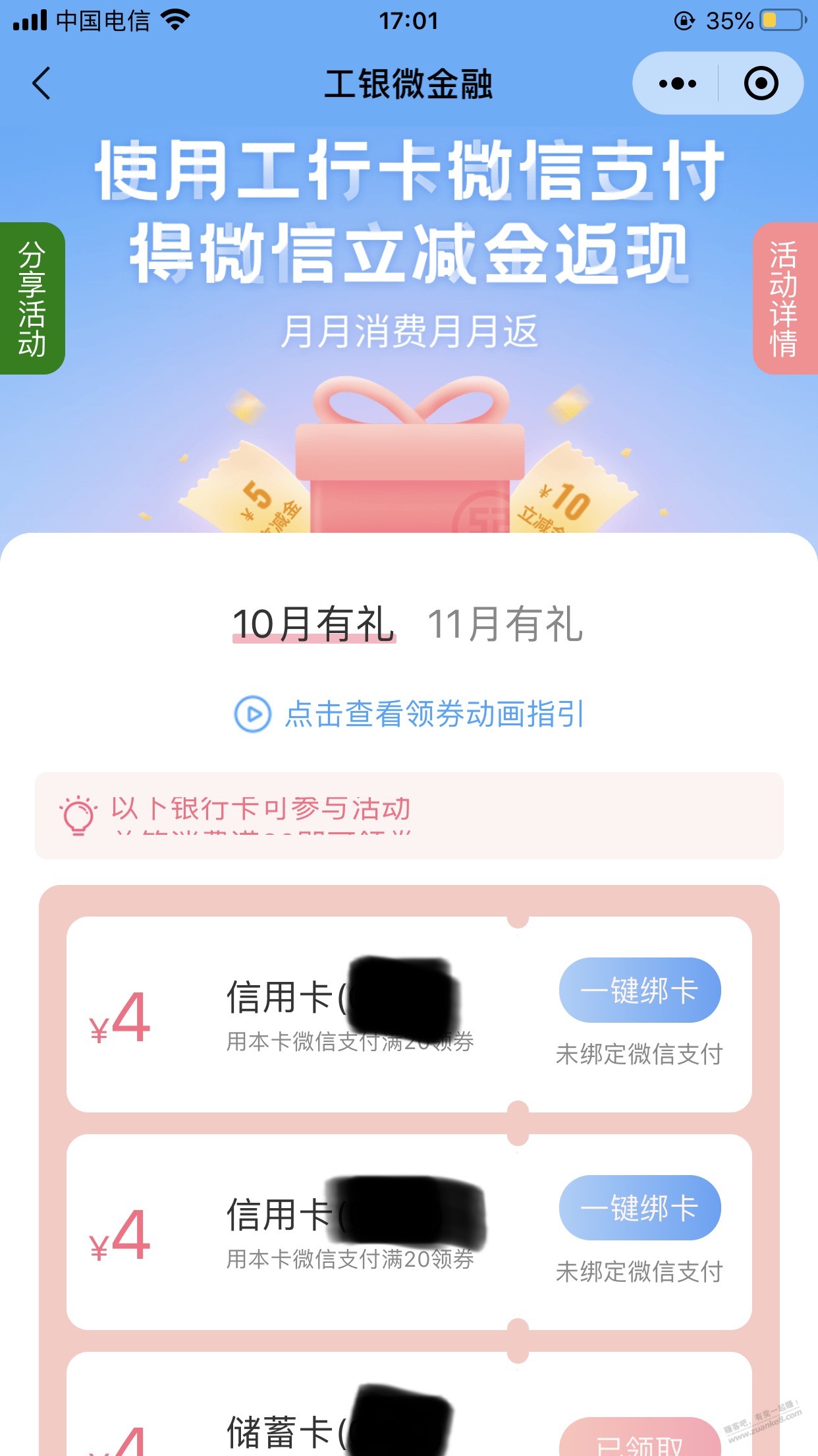 刚才领了工银信使5元立减金。看到,在 工银微金融 小程序,wx消费20元可领立减金,借记卡、xing/用卡都有。