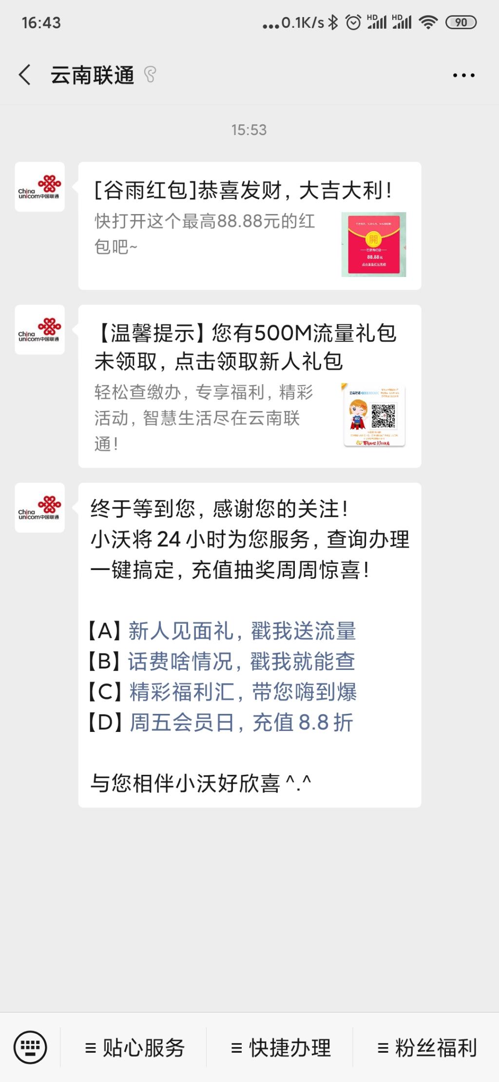 关注云南联通公众号,粉丝福利-谷雨红包。基本0.3-0.6。多号多撸。移动,联通,电信号码均可参加。