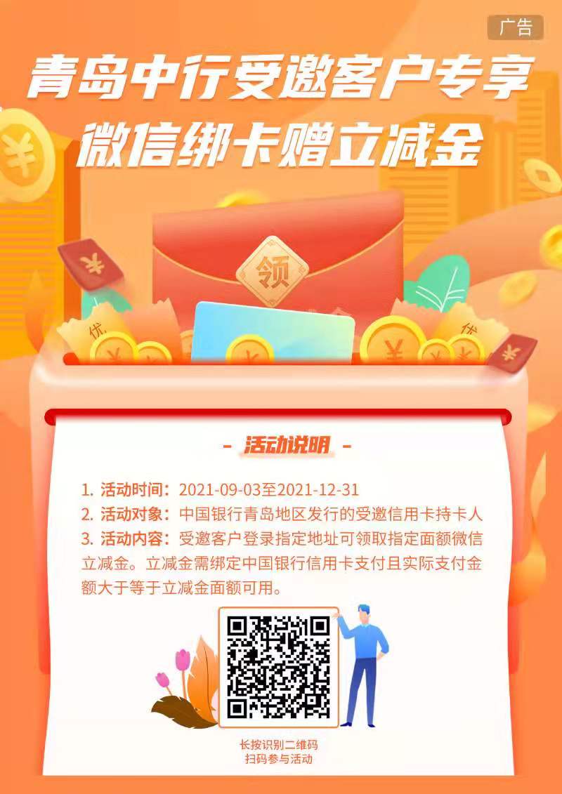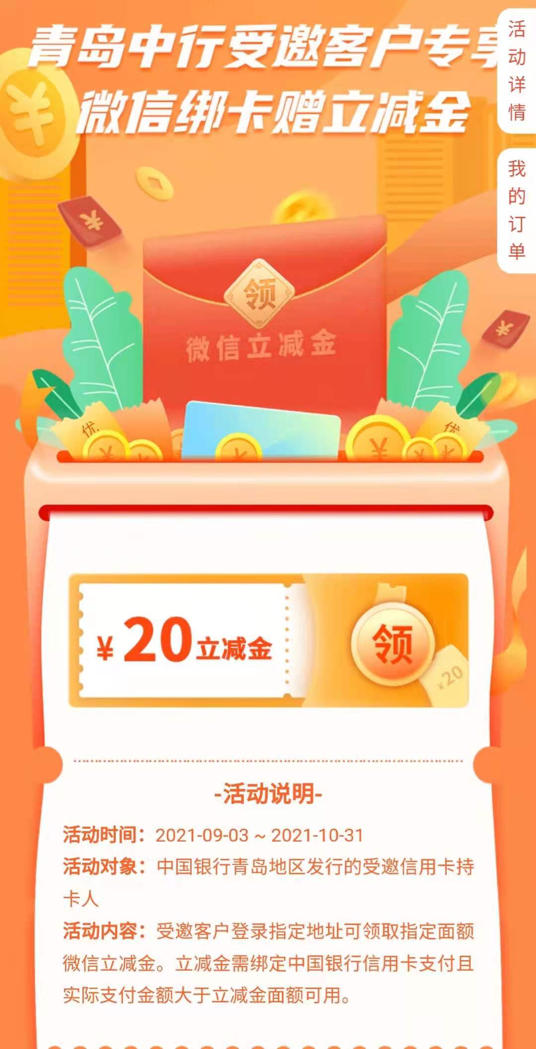 中行青岛20元微信立减金,其他地区可尝试是否能领取