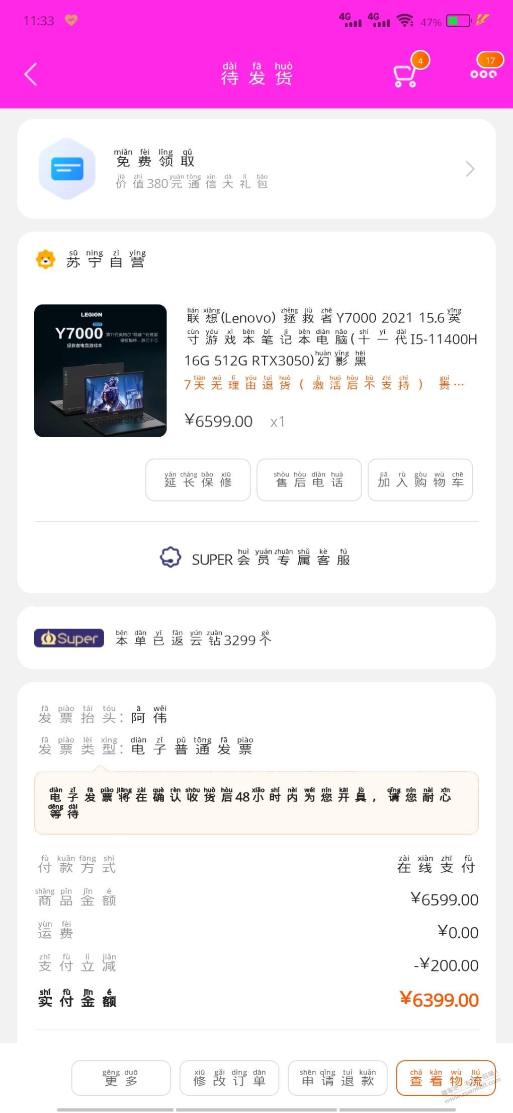 苏宁自营联想官方旗舰店,,选双十一6599那款,付款选光大xing/用卡,减200,和活动价6399持平,买到的加果