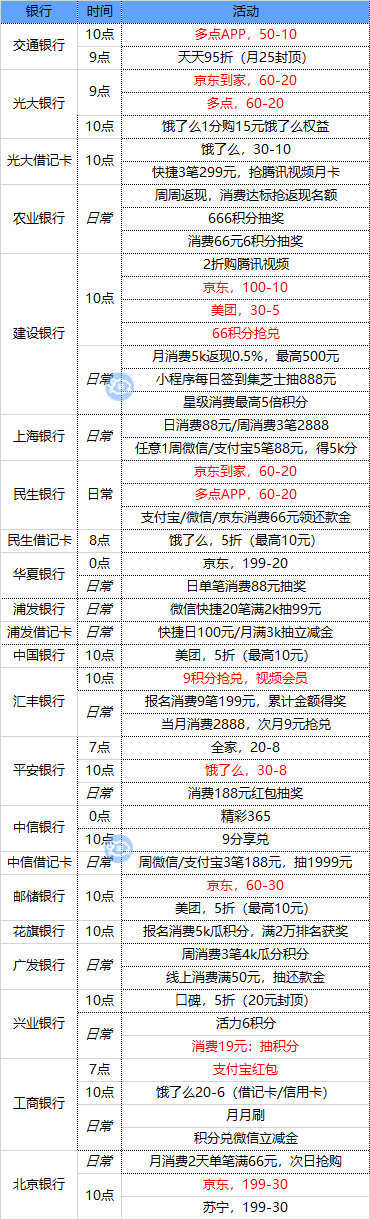 注:周一/支付宝、周二/微信、周三/京东苏宁、周四/云闪付、周五周六/买单吧、周日/美团(4月30日截止)