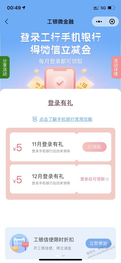 小程序工银微金融,登录工商银行5元,充值零钱4元,2个活动。