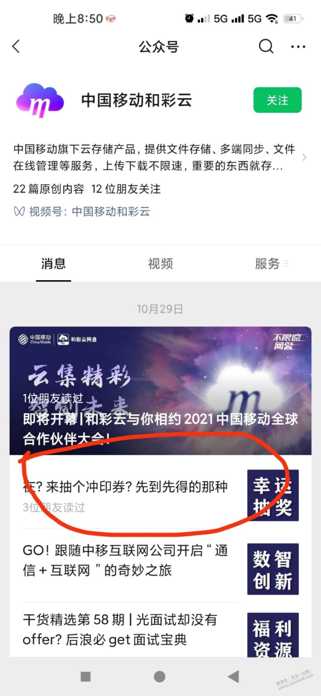 中国移动和彩云公众号,红圈进去,拉到底