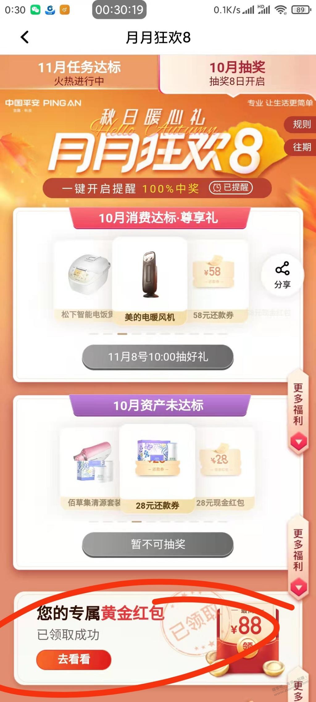 月月狂欢8下面,领红包,两个号都是2.88