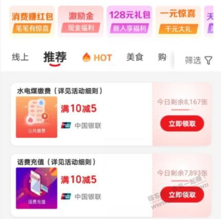 各可以领10次,缴费和充话费,付款时选手机pay付款。