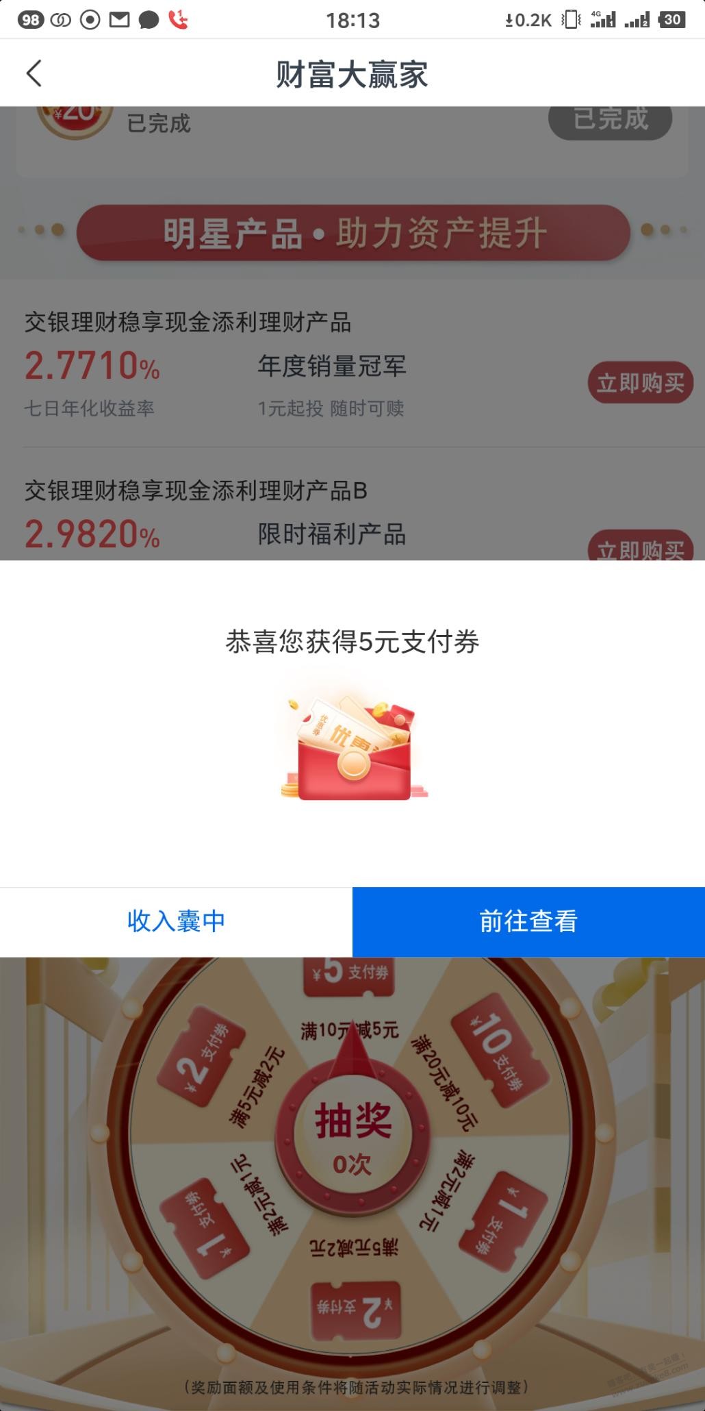 app搜财富大赢家,第一个“看一看理财”,进去浏览,返回。下面底部抽奖。中了5元支付券