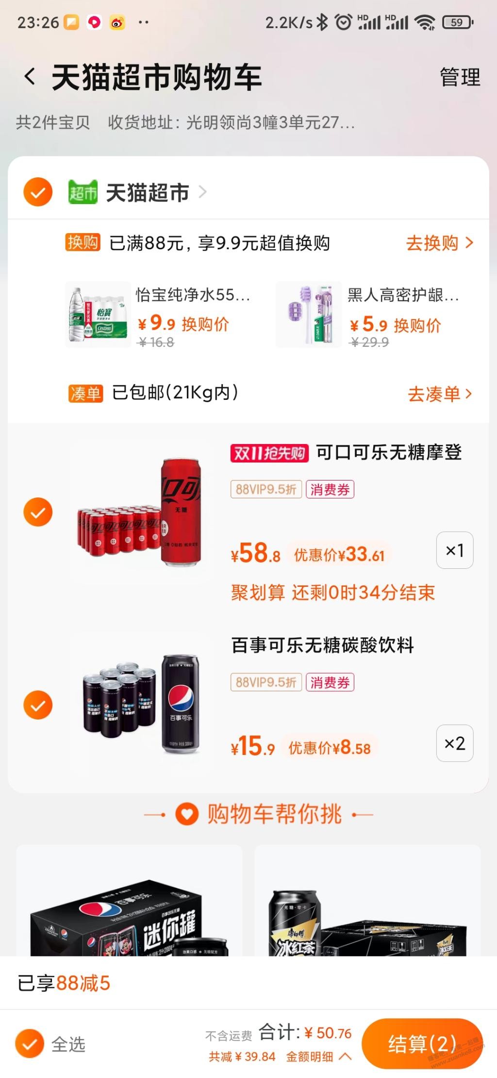 有返超市卡的可以用掉,领88-5,可口的有5元福袋