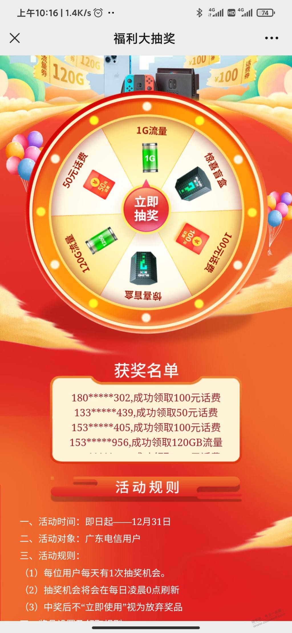 中国电信抽奖最高120G流量100话费
