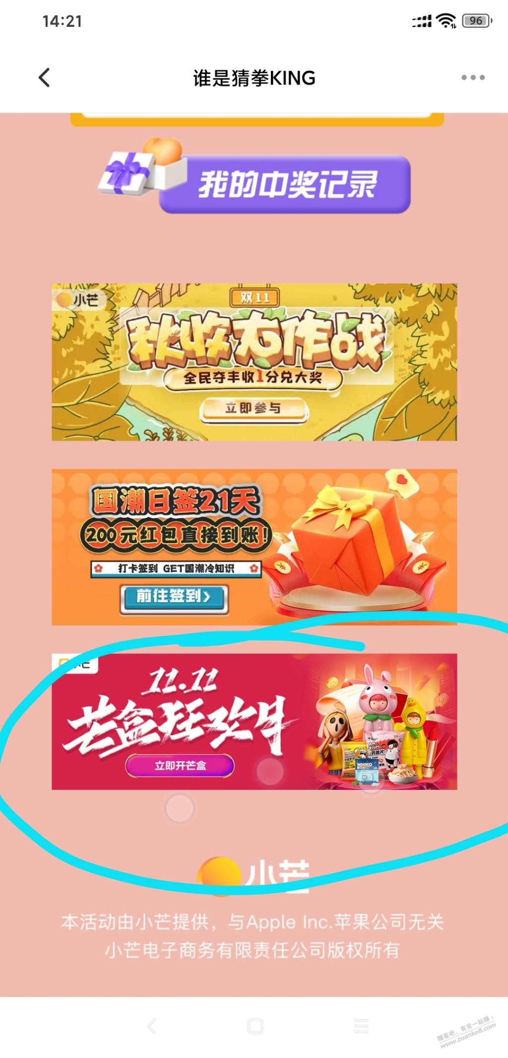 小芒app—我的—中间滚动 玩猜拳游戏—最下1111盲盒狂欢月 刚2-2