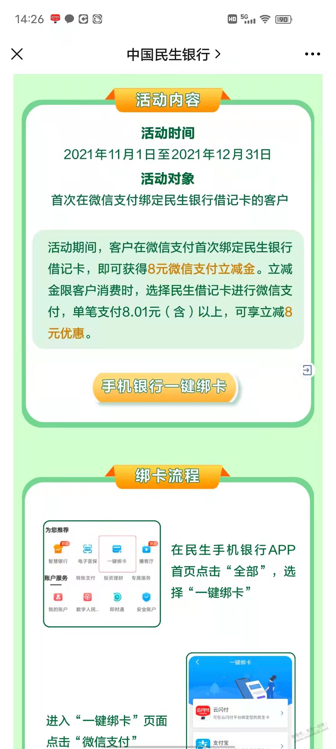 民生银行 首绑微信 8元立减金 需要首绑