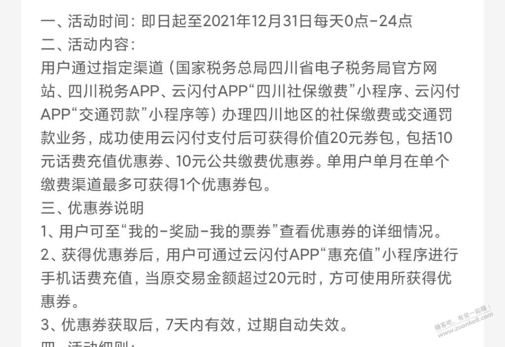 云闪付APP“四川社保缴费”小程序社保缴费,成功使用云闪付支付后可获得价值20元券包,包括10元话费充值优惠券、10元公共缴费优惠券。