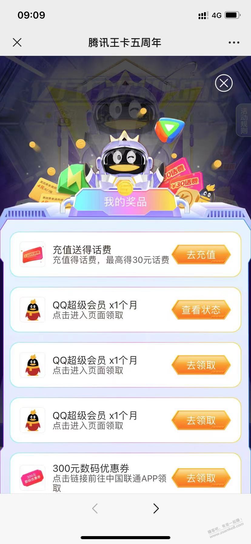 王卡五周年,吧活动任务稍微做下,积分到1800开启特级抽奖,会员有超会月卡,喜马拉雅年卡,酷狗月卡,绿钻月卡,腾讯视频月卡