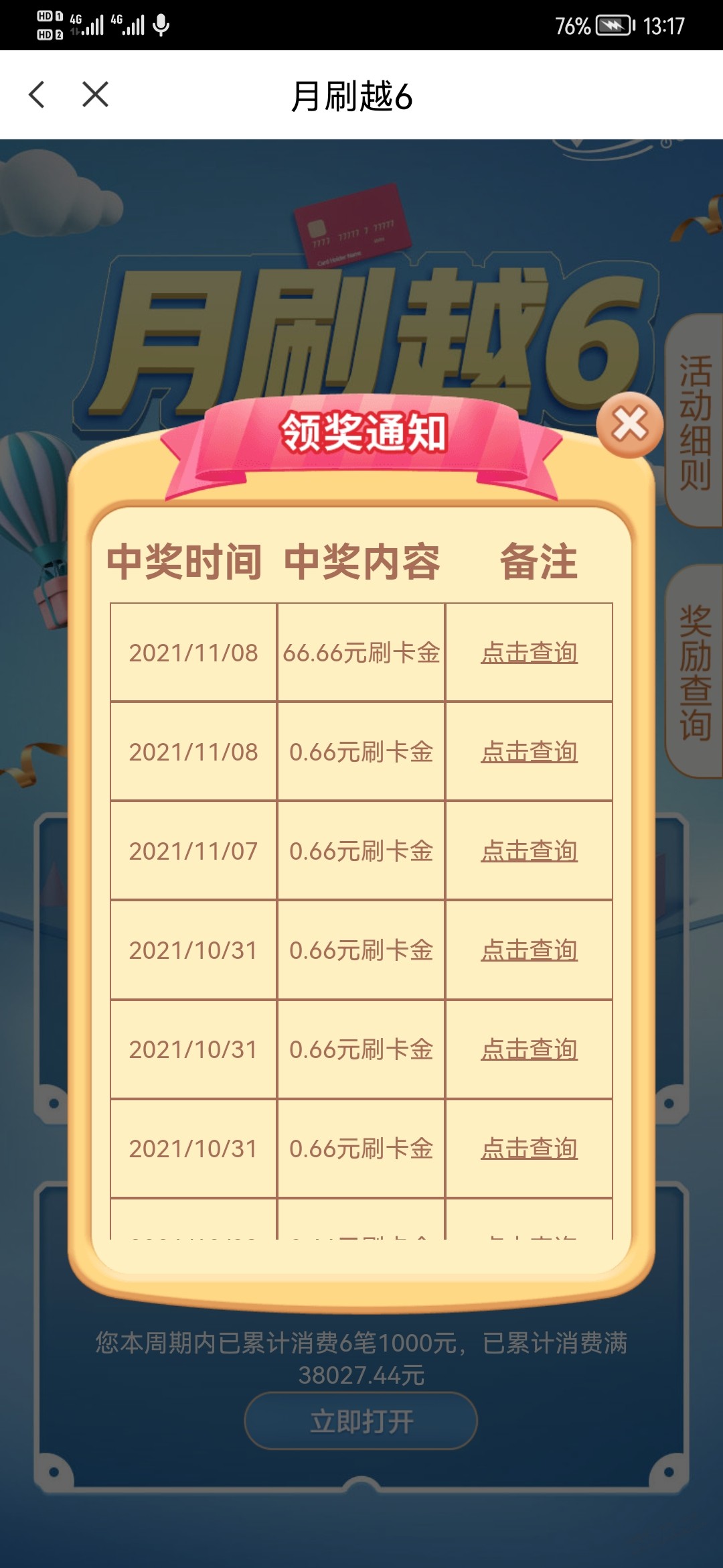浦发的越刷越6,不知道算不算大毛
