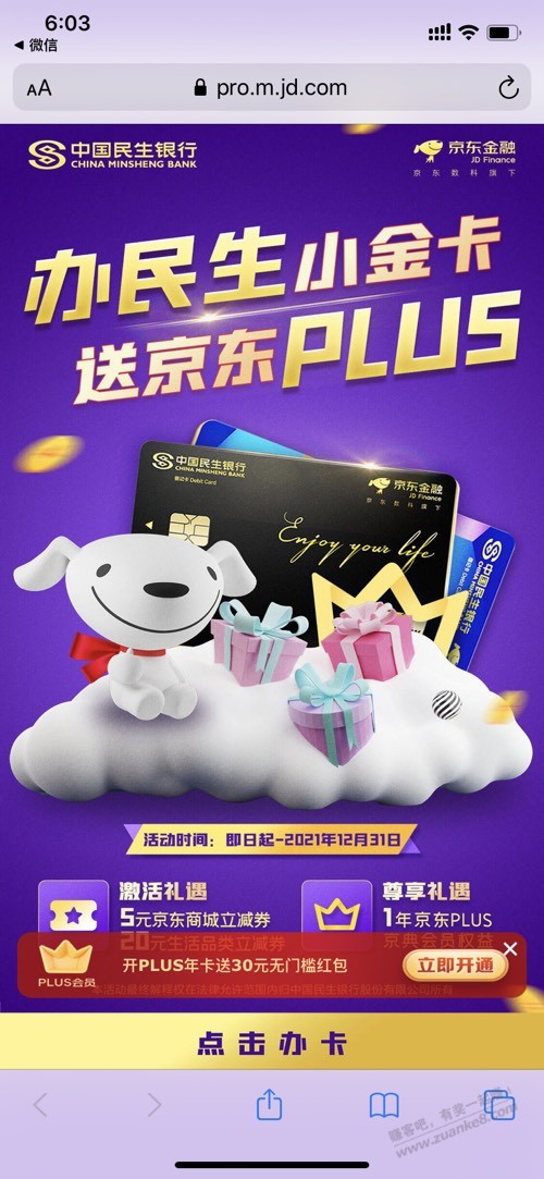 办民生借记卡 送京东plus