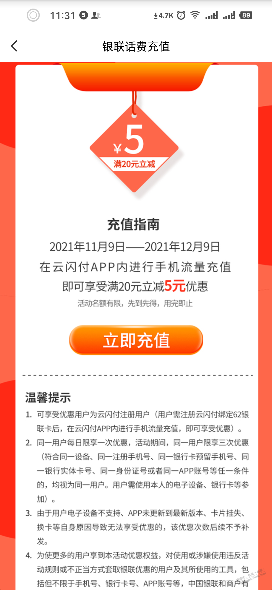 刚开始的云闪付话费20-5