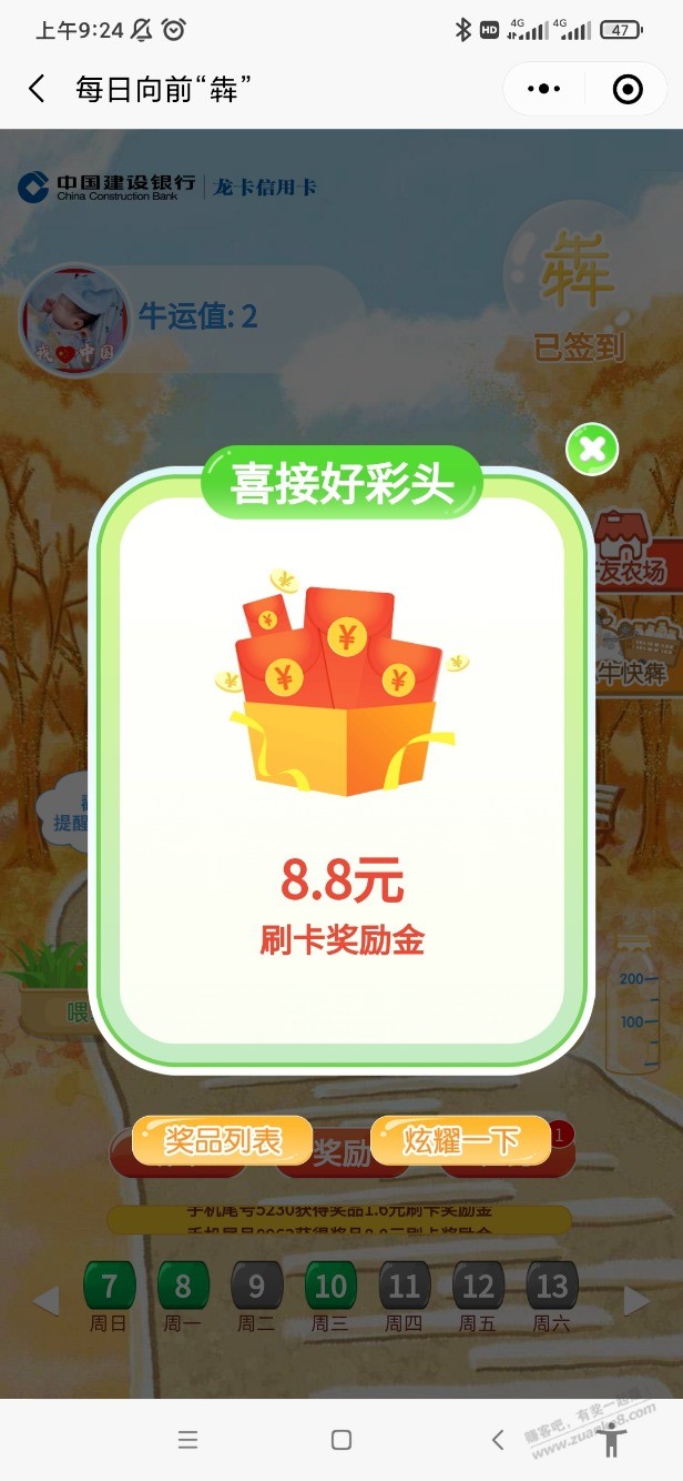 建行小牛快犇!8.8刷卡金,小水吧。。