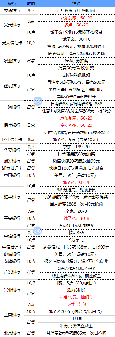 注:周一/支付宝、周二/微信、周三/京东苏宁、周四/云闪付、周五周六/买单吧、周日/美团(4月30日截止)