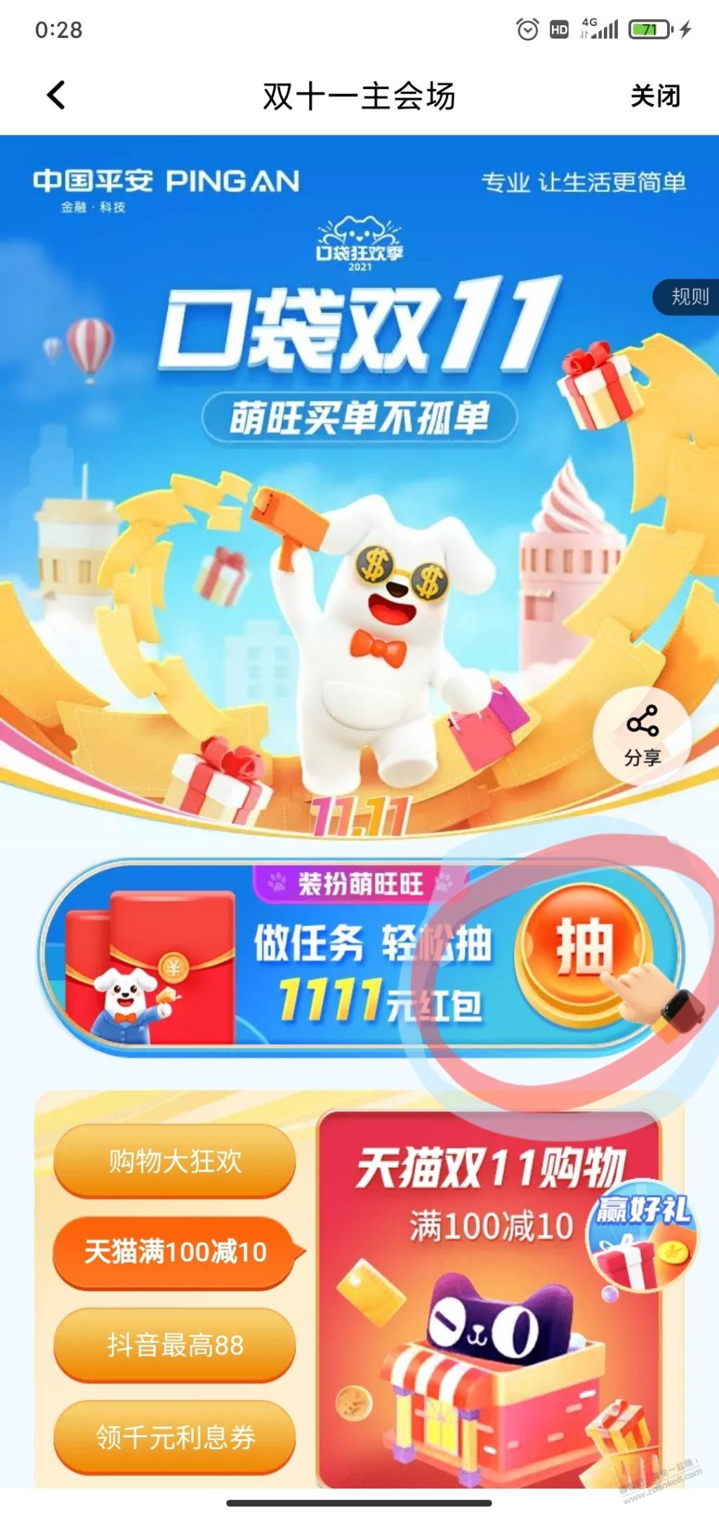 路径:平安口袋银行_首页_顶部轻松抽1111红包,简单做下任务,可抽奖。刚中6.88还款金。