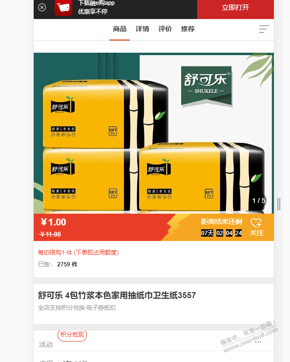工行融E购:1元包邮购4包抽纸,有积分的可0撸