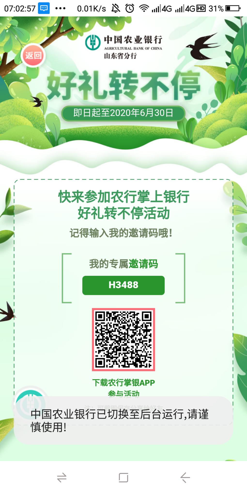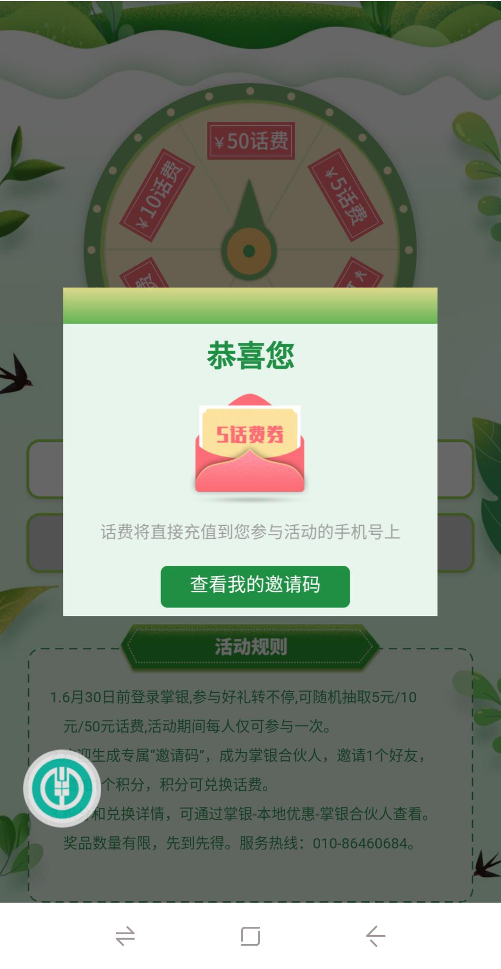 农行APP 生活 本地优惠 好礼转不停 刚中了5元话费,邀请码可填可不填