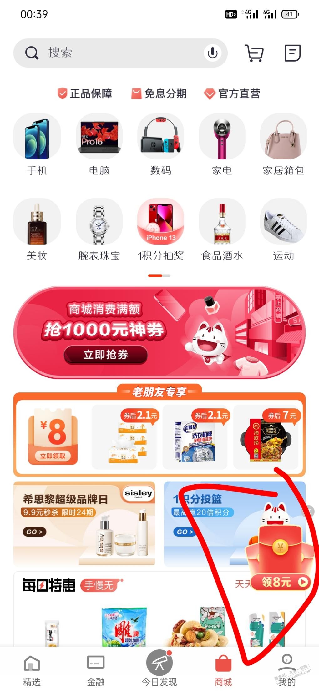 打开掌上生活商城,右下角领八元一共有两个,下面还有一张