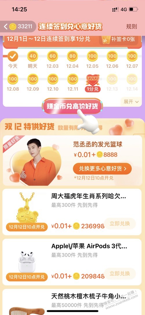 淘宝签到12天1分购周大福和苹果耳机
