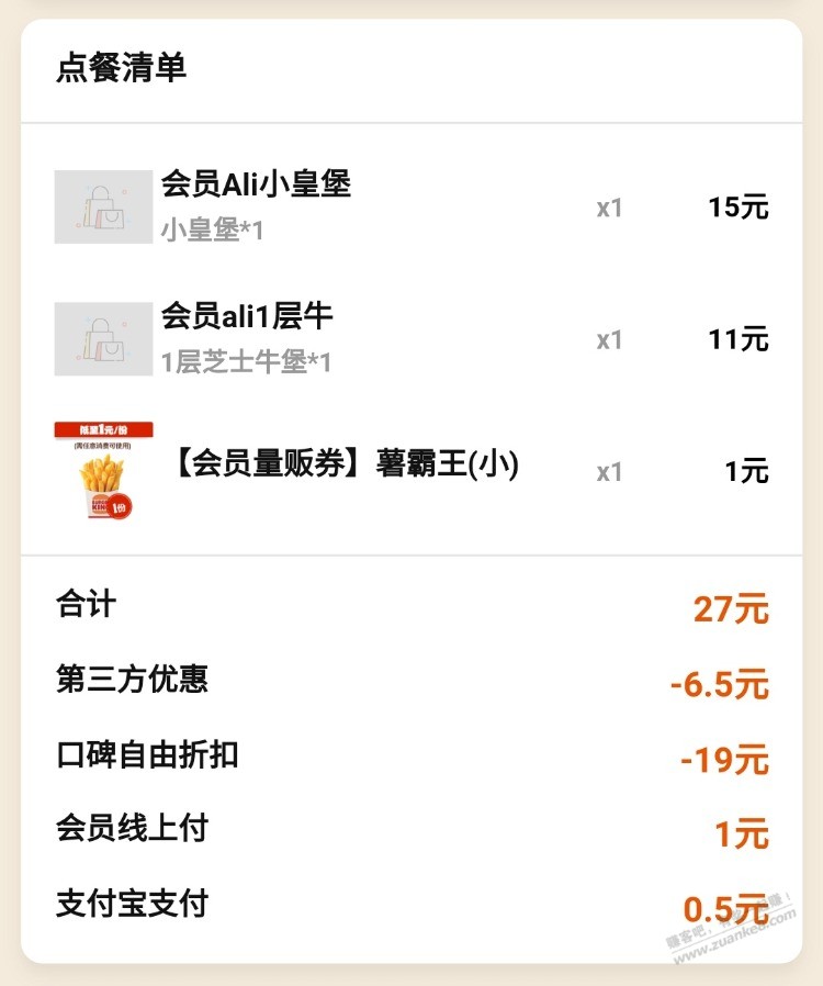 2元撸汉堡王2个小憨堡+薯条