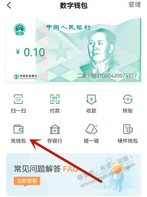 1、打开中国农业银行APP,在首页搜索【数字人民币】进去充值0.01元、或者0.1元到钱包里都可以