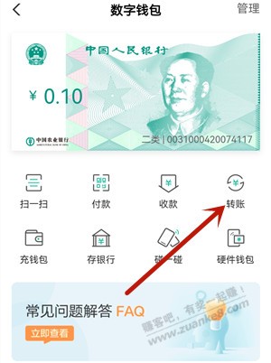 2、然后在数字钱包页面点击【转账】转账0.01元到其他的数字钱包(转账给你自己注册的另外银行的数字钱包也可以,比如前段时间注册的建行数字人民币钱包也行,如果没有,就找个好友相互转账0.01元也可以)