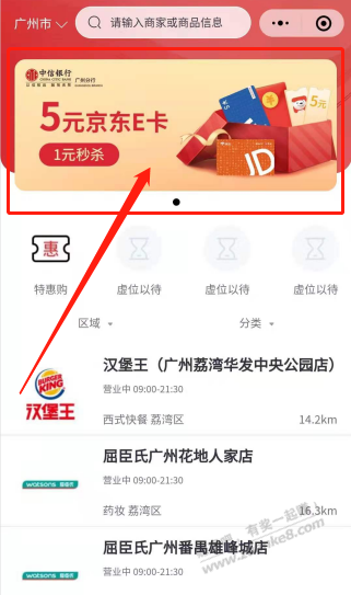 1、微信搜索【中信银行全付通】小程序,点击首页顶部的【1元秒杀5元京东卡】活动,就可以参加活动
