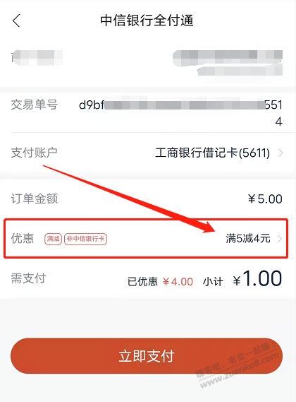 3、绑定后就会出现立减4元的提示,等于1元得到5元京东卡: