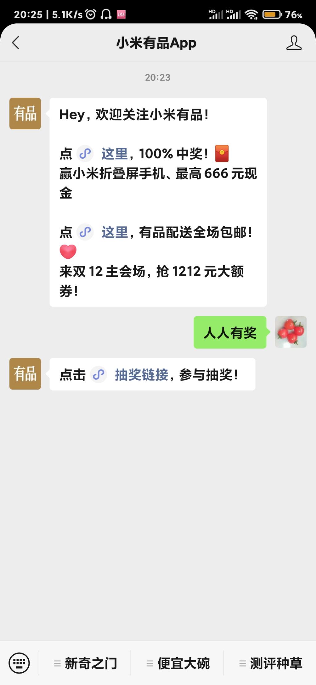 微信关注 小米有品APP 公众号 发送 人人有奖 抽奖必中0.3
