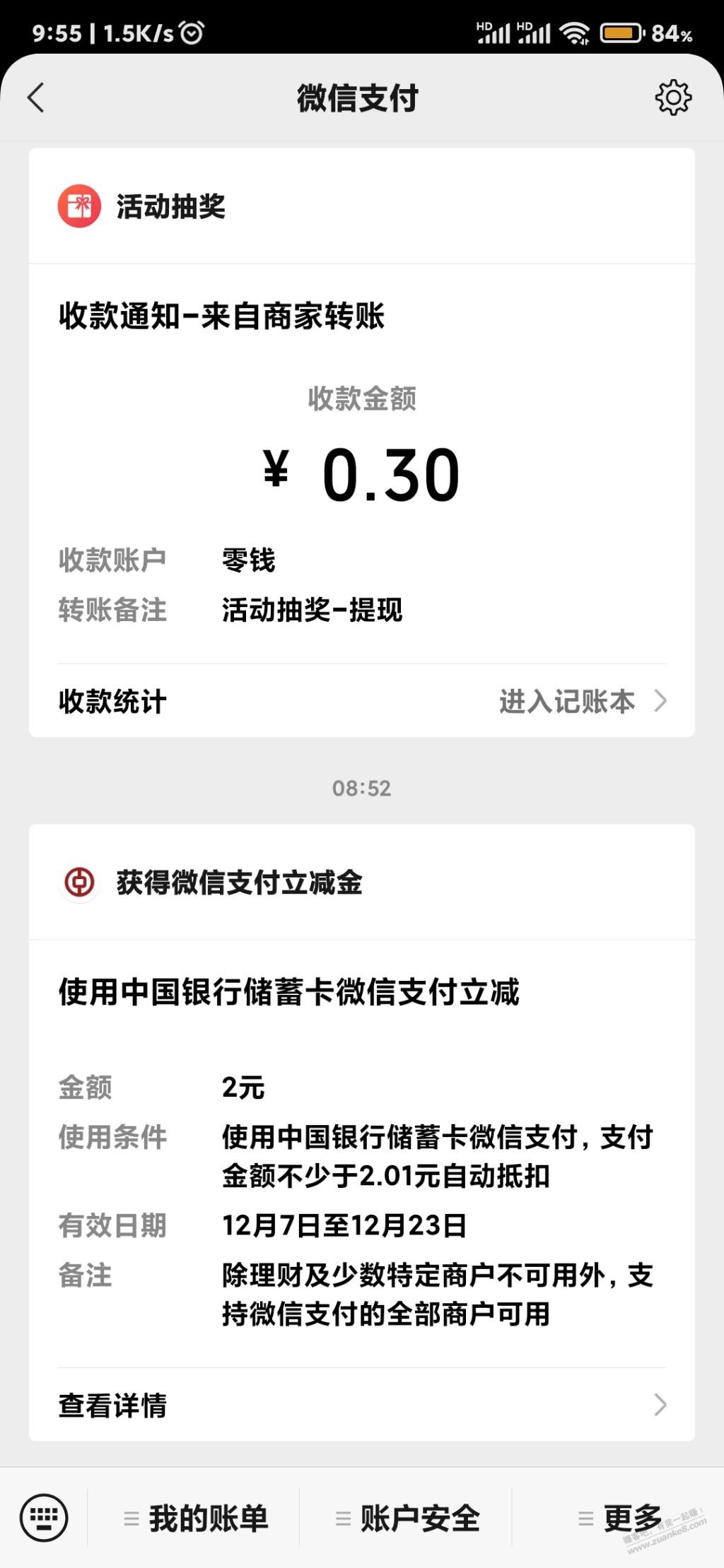 农行,三个活动共抽到10元