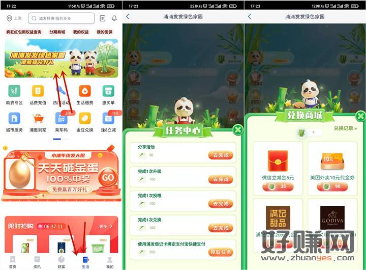 打开浦发银行APP 点击生活 再点顶部轮番图【浦浦发发绿色家园 喂熊猫兑好礼】进入活动