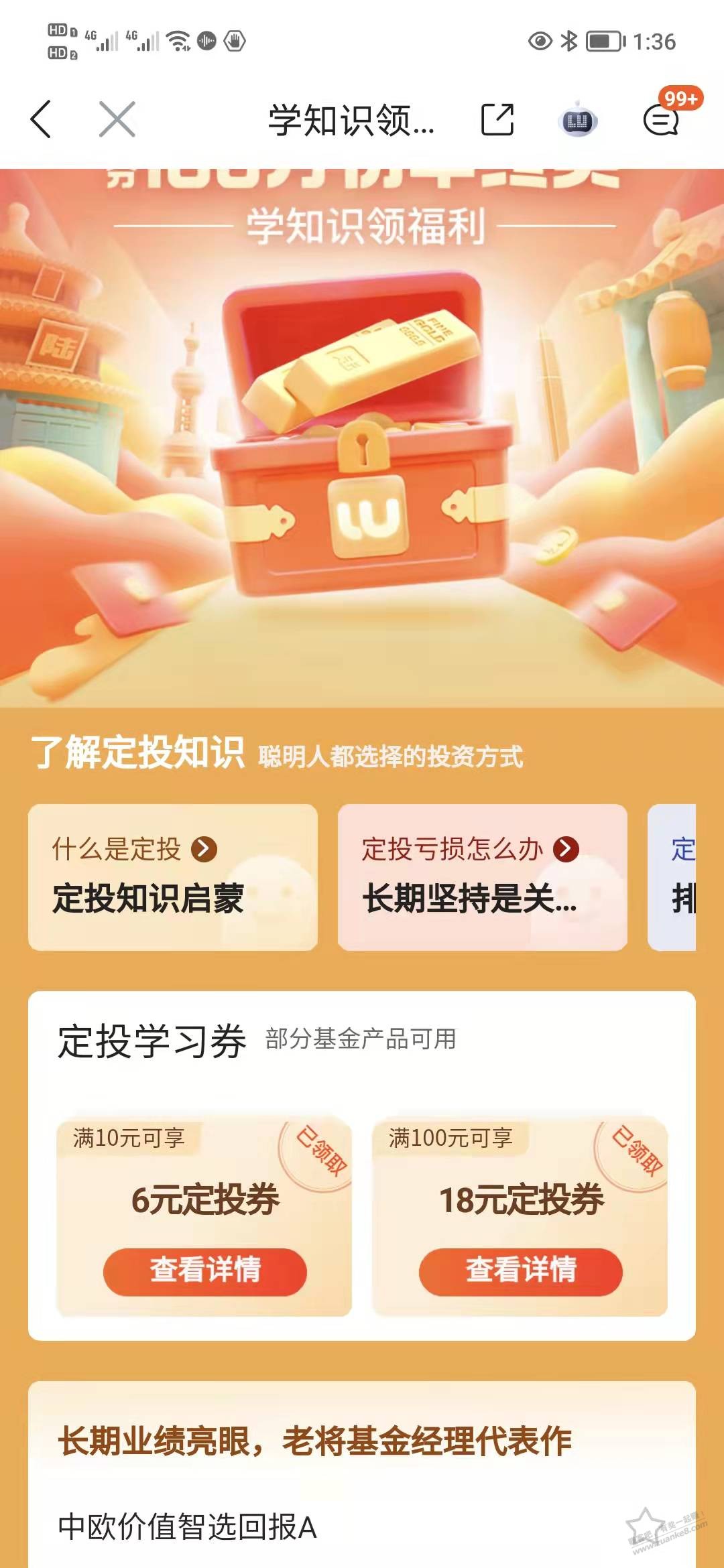 咬牙又续了一个月会员。陆金所首页中间横幅,全民瓜分1亿金豆,点进去召集金豆时,有项是了解定投知识领福利,可领两张定投券。买易方达稳健收益A较为稳妥,95%是债券。