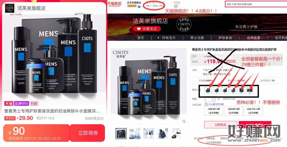 天猫品牌店认证!!速度干!原价119的套餐,现在29元随便选!!非常全面!控油洗面奶、美白面膜、洁面慕斯、去角质神器、爽肤水、水乳霜、去黑头贴~从洁面到护肤,一套搞定!告别油腻男,改善脸上油光痘痘,洗出清爽面孔!洁芙泉大牌!累售200w+件!