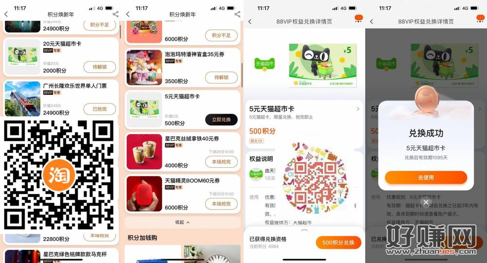 【淘宝积分兑5~20元天猫超市卡】打开淘宝APP->5元的猫超卡扫第二个码直达兑换->是88VIP的话扫第一个->全积分兑->下拉->兑换20元猫超卡!这个限88会员。5元的不限制都可以领。一会叠加攻略,0-1沅到手各种家清,年底积分要清一清了!