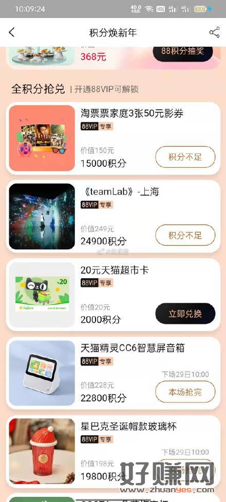 淘宝app-我的淘宝-88VIP-积分焕新年,2000积分兑换20猫超卡,500积分兑换5元猫超卡
