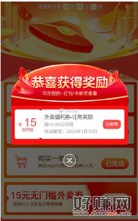 美团外卖完成任务可领15外卖券