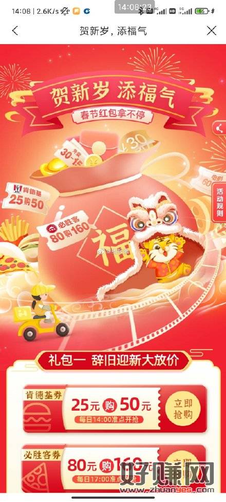 建行生活APP,首页贺新岁,添福气每天11点外卖30-15,