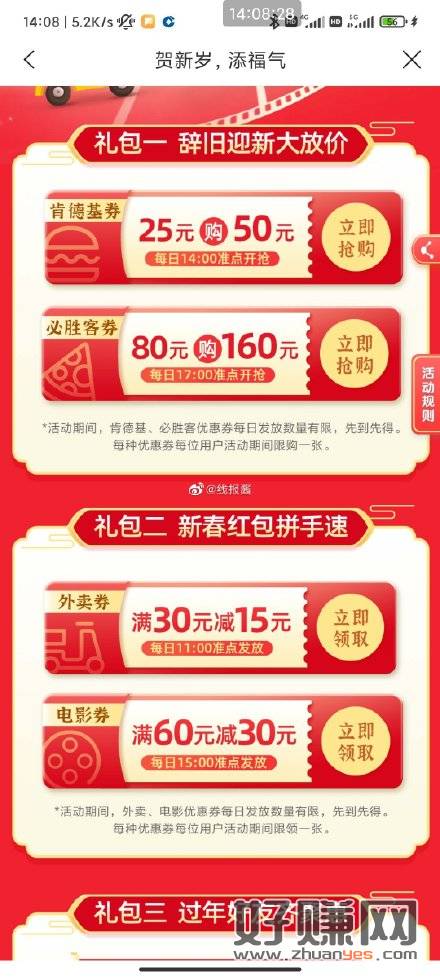 每天11点外卖30-15,14点25买肯德基50代金券,15点电影票60-30,17点80买必胜客160代金券