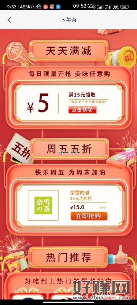 10点,浦发银行APP,生活,下午茶,有15-5和半价奈雪