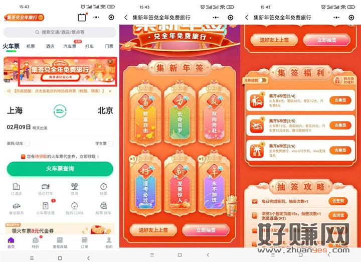 集齐4种不同签获得8元火车/汽车无门槛红包,每天可做任务,活动2月17日结束!