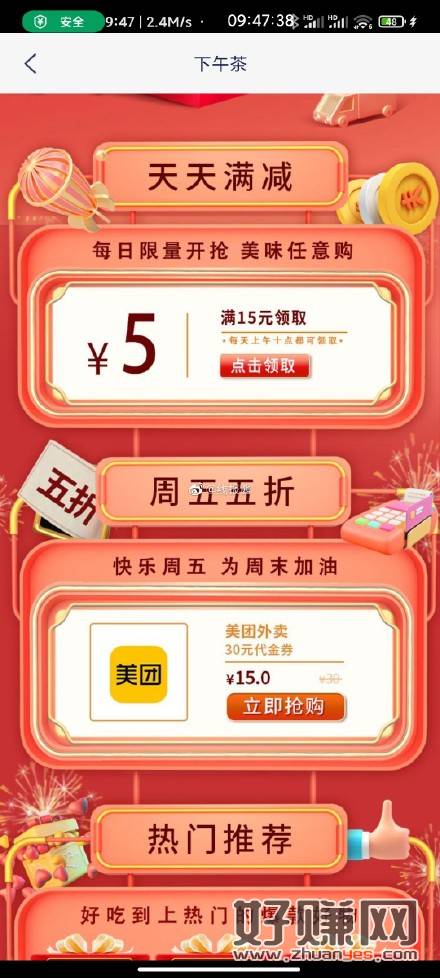 10点,浦发银行APP-生活-下午茶,有15-5和15买30美团外卖券