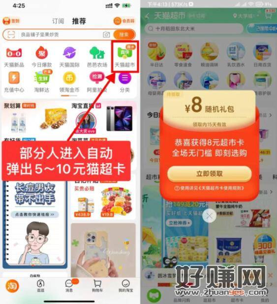 打开淘宝APP 点击首页的天猫超市进去,部分人进入会自动弹出5-10元猫超卡