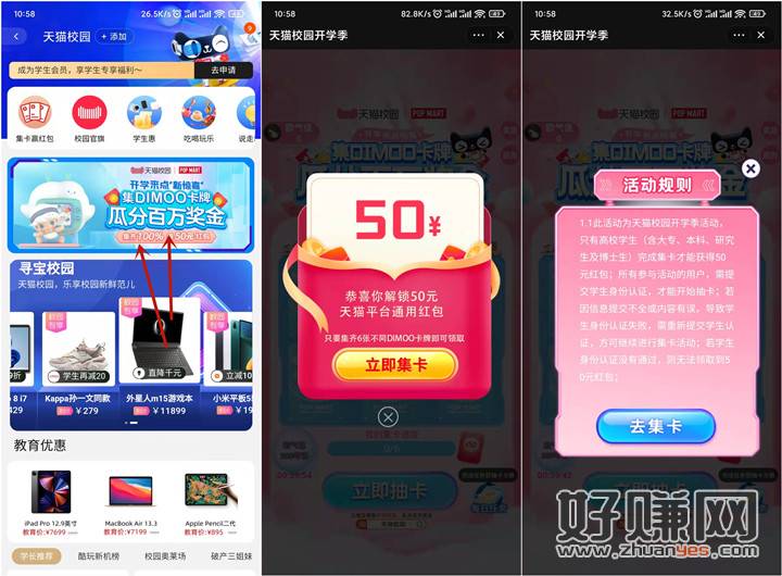 打开淘宝APP首页搜索【天猫校园】点击横幅进去 然后点顶部轮番图【集DIMOO卡牌 瓜分百万现金】进入活动