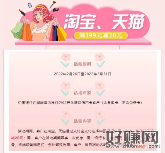 湖南中行xing/用卡 淘宝399-20+消费有礼