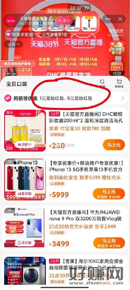 淘宝直播搜【天猫官方直播间】点商品有8元红包